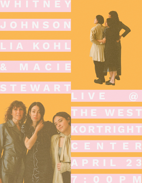 Whitney Johnson, Lia Kohl, and Macie Stewart are a trio who utilize string instruments, voices, and manual tape effect processing to craft compositions from alternately tranquil and disquieting improvised music. The three musicians are individually rooted in deep sound exploration, multi-disciplinary composition, and all manner of cross-genre collaboration. They are performing at the West Kortright Center on Thursday April 23rd at 7pm. The opening act will be Graham Jones aka Gathering of Angels